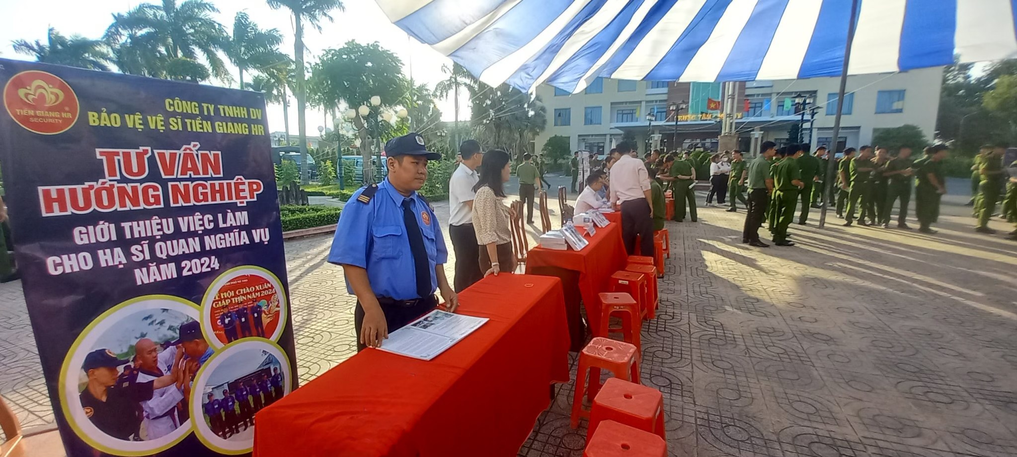 Ngày 29-1, Công ty TNHH DV Bảo vệ - Vệ sĩ Tiền Giang HR tham gia ngày hội tư vấn tổ chức định hướng nghề nghiệp (nghề bảo vệ) cho 238 đoàn viên thanh niên là chiến sỹ nghĩa vụ CAND của Công an tỉnh Tiền Giang chuẩn bị xuất ngũ năm 2024.